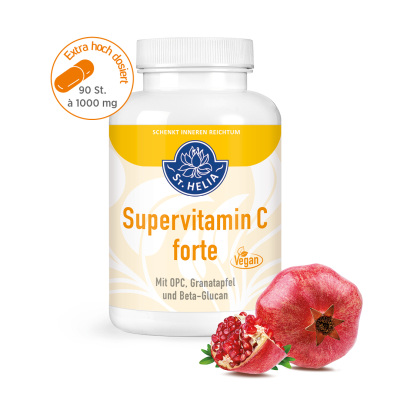 Supervitamin C forte versorgt Sie mit basischem Vitamin C mit Bioflavonoiden (Vitamin C2), OPC, Granatapfel und Beta-Glucan.